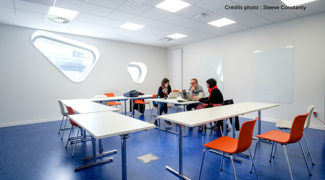 Un espace dédié à la formation avec un mobilier modulaire, un écran numérique interactif, un système de visio basé sur Webex, une classe mobile, des tableaux en verre pour brainstormer…