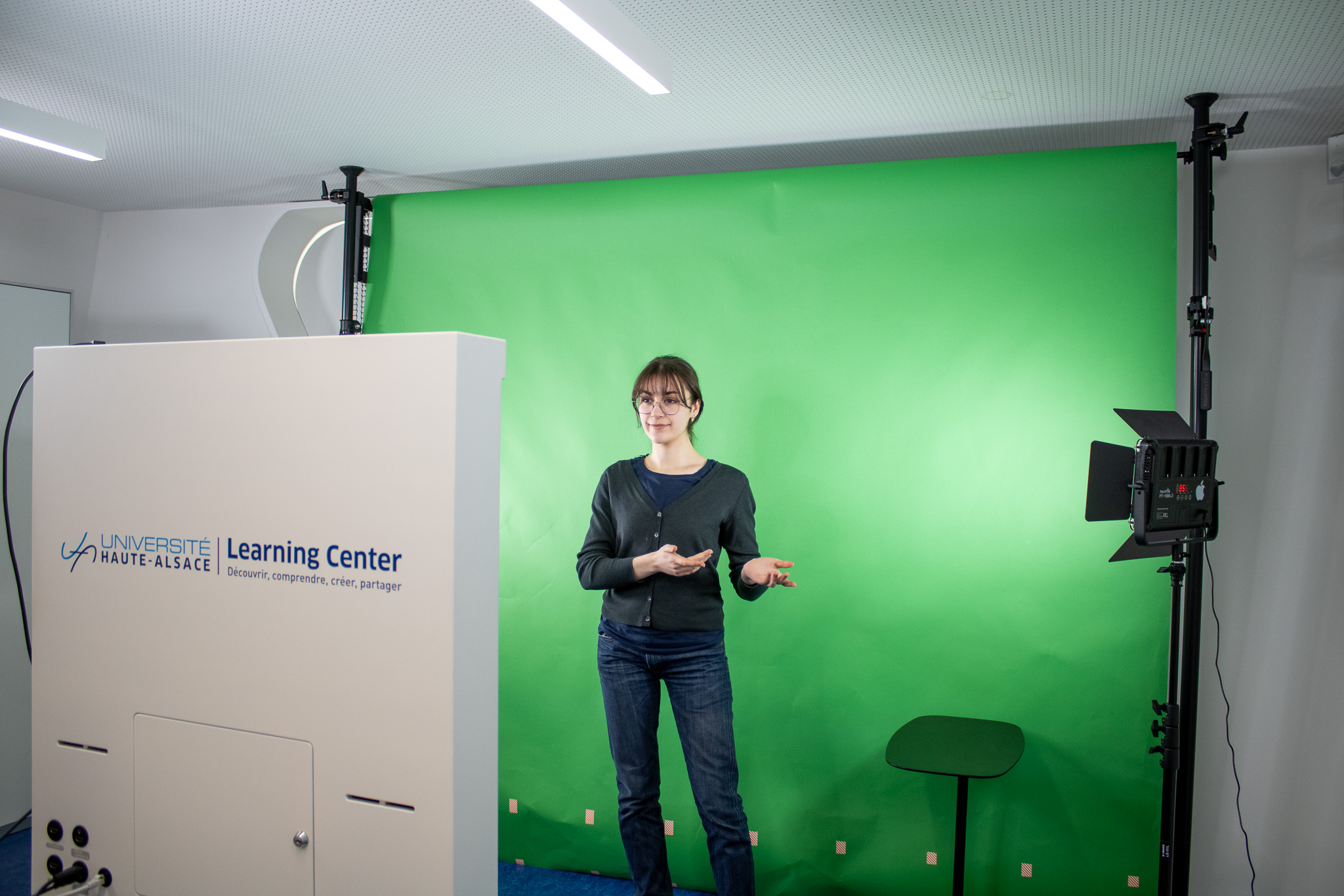 Le studio Alice Guy est notre studio de conception de vidéos. La salle est équipée d'un vidéomaton qui vous permet de créer et monter, en toute autonomie, des vidéos. Eclairages, micros et fond vert sont mis à disposition. Notre concepteur audiovisuel peut vous accompagner à chaque étape si vous en avez besoin.