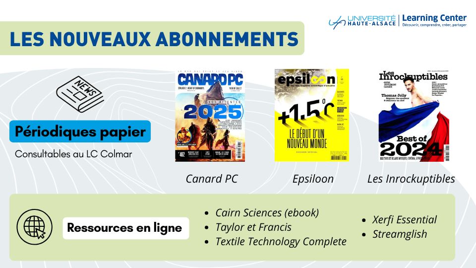Il y a du nouveau ! Découvrez les nouvelles revues et ressources numériques auxquelles le Learning Center s’est abonné.